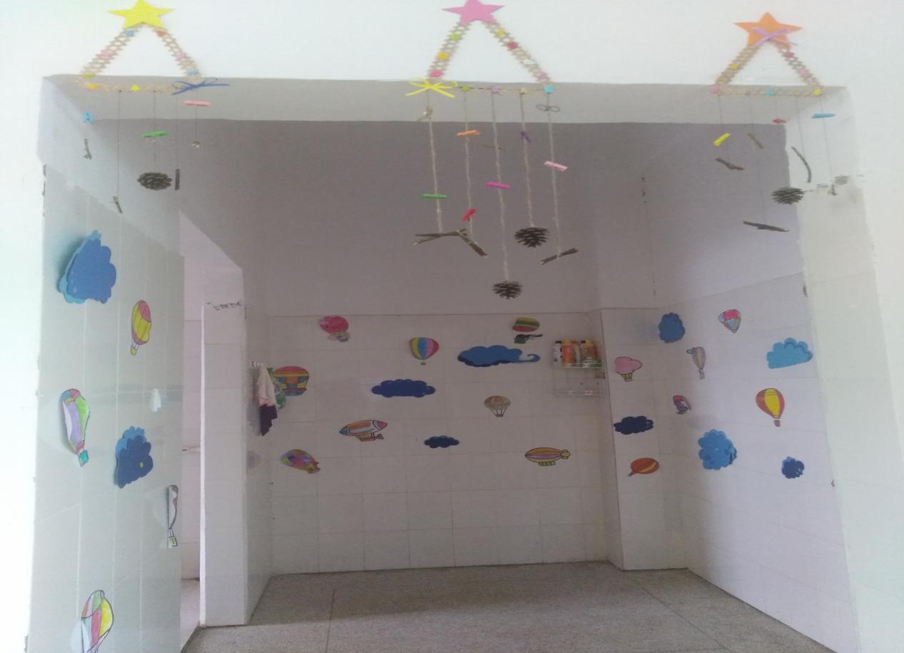 为了让孩子们拥有一个温馨舒适的生活环境,庄口中心幼儿园全体教师充分利用午休和晚上时间加班加点,对寝室和厕所环境进行精心布置。教师对此次活动十分重视,分年级组构思设计、收集材料,利用硬纸板、细绳、树枝、纽扣、松树子、纸杯、CD碟、塑料瓶等变废为宝,巧妙而富有创意的布置,给孩子们美的熏陶和艺术的启迪。
